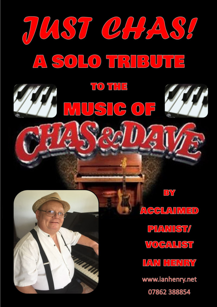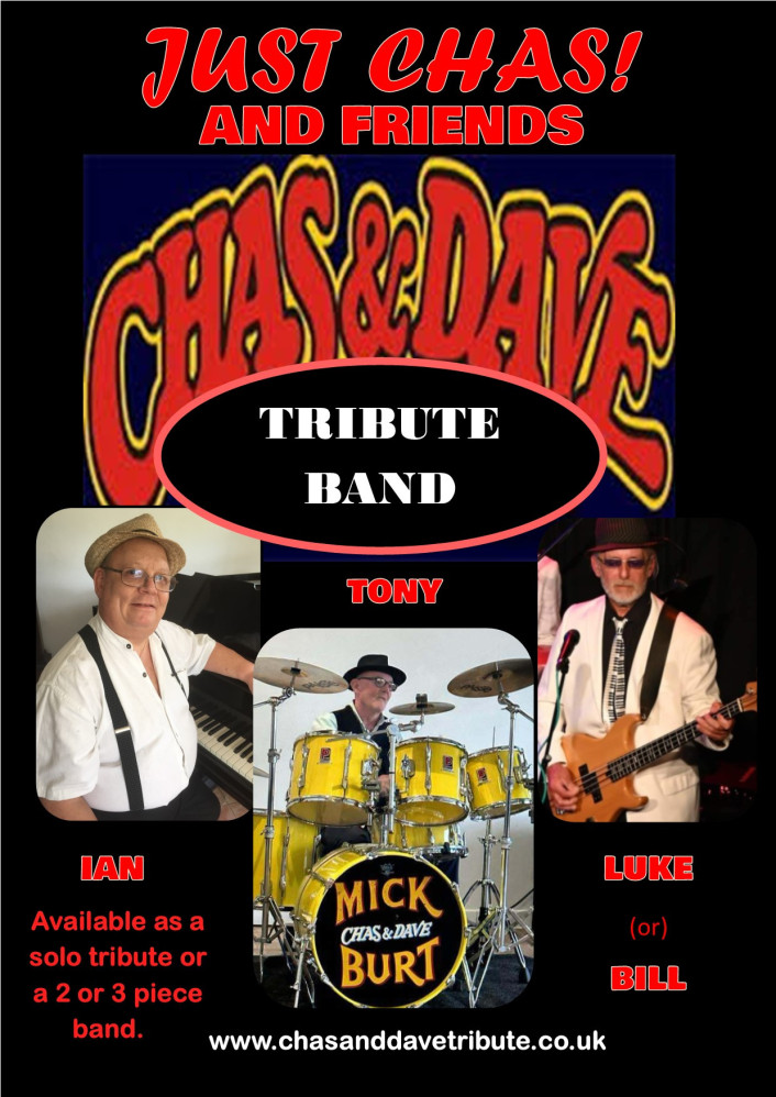 JUST CHAS! and is available as a solo tribute act with Ian alone or a 2 or 3 piece band, sometimes with Tony Burt, son of Chas and Dave's legendary drummer Mick Burt. This show can be mixed with an extra set of cover songs as required.